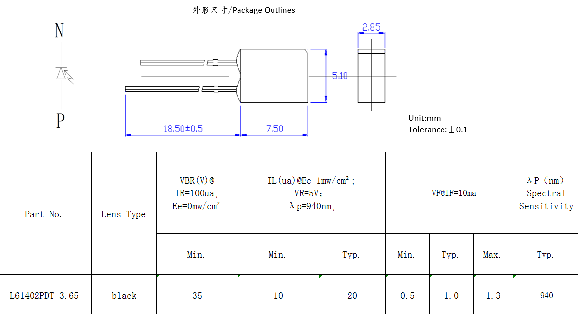側(cè)面紅外接收管。特征:紅外輸出功率高,響應(yīng)速度快。應(yīng)用:高速紅外通信,光學(xué)開(kāi)關(guān),光電傳感器,攝像頭,煙霧傳感器